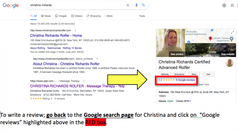 To Write a Google review click on "Google reviews" (as shown in the sample picture, highlighted below in the red box). Please note: to get to the active google search page to submit your review, you must click on this green Google link below: